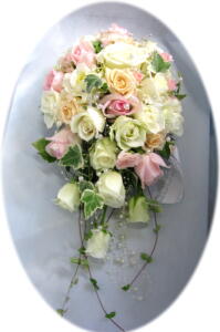 パステル系のバラ数種類使ったセミキャスケードブーケです。パールのデコレーションがゴージャスに揺れます。
